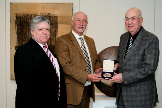 (Foto: Berno Müller): Als Dankeschön für die große Unterstützung in der Kulturstiftung Rhein-Neckar e.V. zeichnete Vereinsvorsitzender Landrat Dr. Jürgen Schütz seinen scheidenden Stellvertreter Helmut Beck (rechts) mit der Ehrenmitgliedschaft des Vereins aus, sichtbar gemacht durch die von Künstler Piet Sohl geschaffene Bronzemedaille, die ein stilisierter Dilsberg über der Neckarschleife ziert. Links auf dem Bild der neue Zweite Vorsitzende der Kulturstiftung, Philipp Krämer.