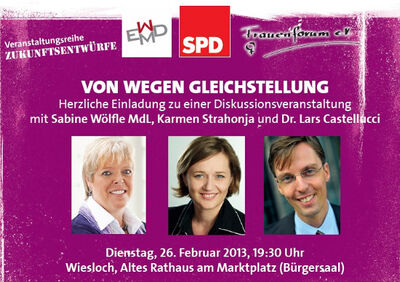 Die Veranstaltungsreihe „Zukunftsentwürfe“ geht weiter, am 26. Februar zum Thema Gleichstellung im Alten Rathaus in Wiesloch. Ich freue mich, dass Sabine Wölfle MdL, zuständige Sprecherin im baden-württembergischen Landtag, zugesagt hat. Wir laden ein gemeinsam mit dem Frauenforum und einem internationalen Netzwerk von Frauen aus dem Bereich der Wirtschaft. Neue Wege: weniger gepachtete Weisheit, mehr Impulse aus dem offenen Diskurs. Darauf freue ich mich.