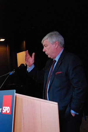 Auch Michael Sommer sah klare Chancen in der Krise. Diese sei noch nicht überwunden und man müsse dieses Jahr noch um einige Arbeitsplätze kämpfen. „Aber Furcht ist ein schlechter Ratgeber. Dass wir alles tun, um die Arbeitslosigkeit unten zu halten ist auch klar. Aber lasst uns politisch nach vorne schauen.“ Die Gesellschaft sei wieder „sozialdemokratischer“ geworden. Auch Sommer verglich die derzeitige Situation mit der vor einem Jahr. „Wenn ich letztes Jahr hier zu Euch gesprochen hätte und hätte ein 50 Milliarden Konjunkturprogramm gefordert... dann hätte man mich eingeliefert“, sagte er drastisch. Nach der Bankenpleite in den USA sei es jedoch kein Problem gewesen, innerhalb einer Woche eine fünfmal so große Summe aufzutreiben. „Ein Staat, der Banken rettet, eine Politik die dies zuwege bringt, die sind wohl doch nicht so handlungsunfähig wie es lange Zeit hieß.“ Dies sei eine gute Entwicklung, man müsse aber im Auge behalten, für wen das Geld verwendet wird. Es gehe nicht darum, Banken oder Firmen zu retten, die sich selbst ins Aus manövrieren. Aber es gehe darum, das Wirtschaftssystem aufrechtzuerhalten, und damit Arbeitsplätze für viele Menschen zu sichern. „Die Marktwirtschaft“, stelle Sommer heraus, „ist nichts schlechtes, solange sie der Gesellschaft etwas bringt. Und um das zu sichern ist eben manchmal mutige politische Gestaltung nötig“. Dass eine solche Forderungen jetzt wieder möglich sei, ohne als „Dinosaurier“ und „Ewiggestriger“ belächelt zu werden sei ein positiver Nebeneffekt der Krise. Um Deutschland dauerhaft „krisenfest“ zu machen brauche man weiter solchen politischen Mut und müsse Fragen wie Wirtschafts-, Bildungs- und Beschäftigungspolitik als einen gemeinsamen Entwurf betrachten. Dass er in dieser Hinsicht große Hoffnungen in die SPD setze, daraus machte der DGB-Vorsitzende keinen Hehl. Die GenossInnen dankten es mit tosendem Applaus.